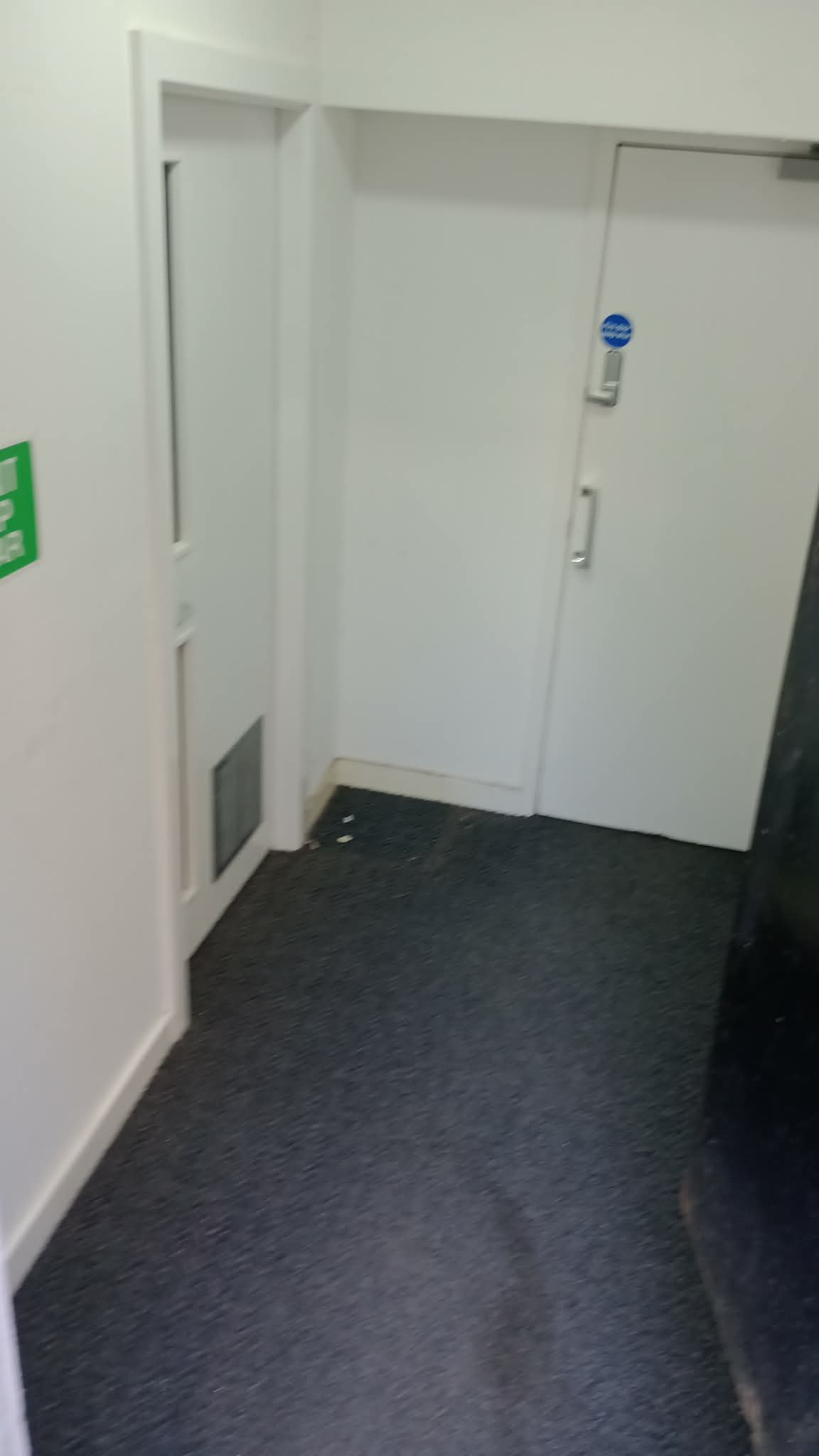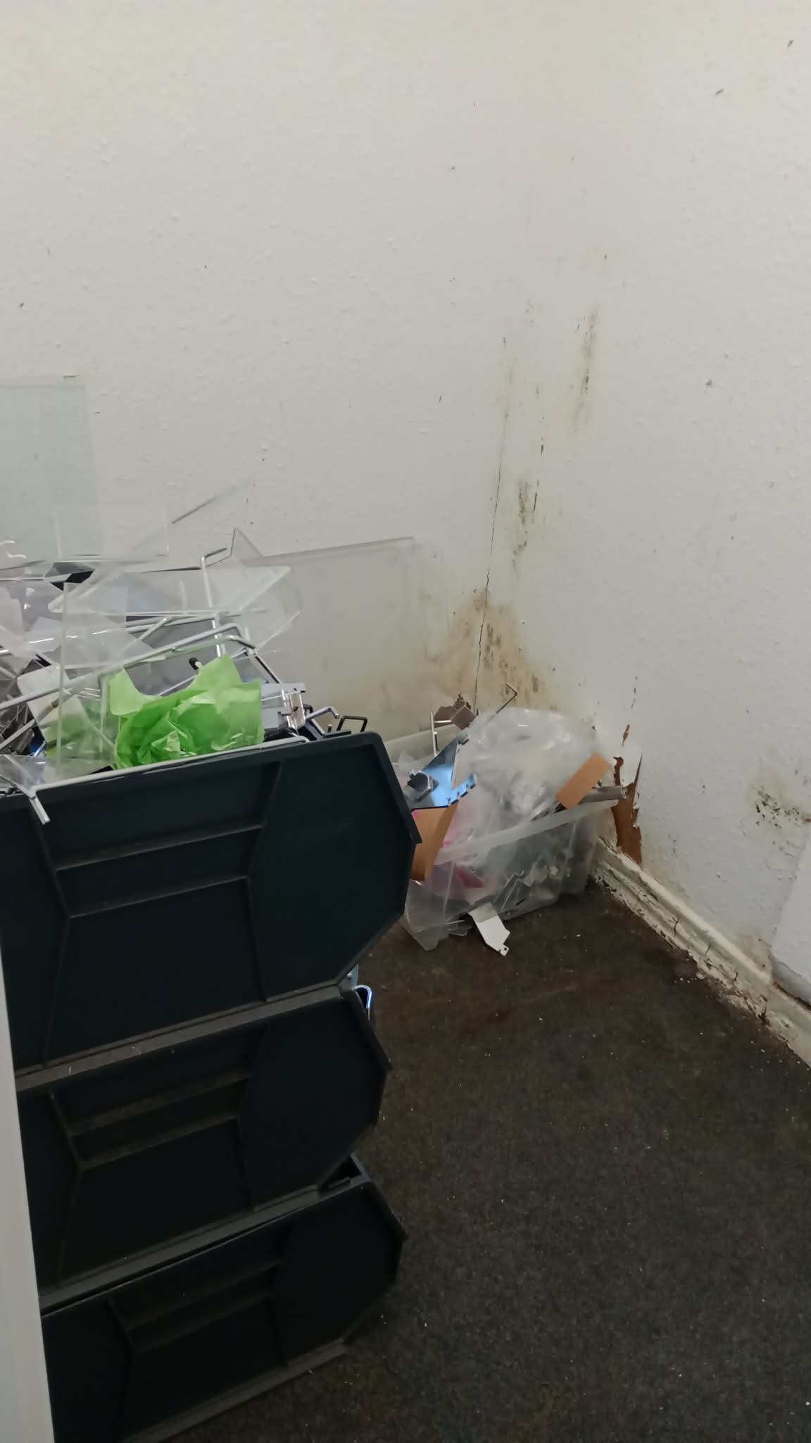 The wooden shelves, (which we needed to keep) found a new home, behind the door of the room, while the larger stuff that needed keeping, got put in the Air Handling Plant Room next door. It wasn’t until we emptied the room, that we discovered DAMP! So I went and got the god old Damp Spray and gave the walls a good spraying. Hopefully, it will dry out soon. (Now it has been treated properly.)