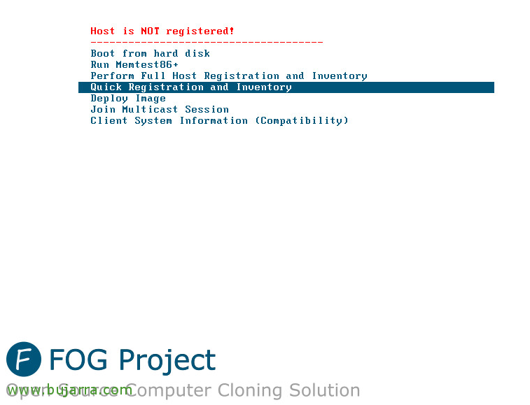 On your Reference Workstation, boot to the Network. On the Fog Window, select Quick Registration and Inventory. This will register the machine in FOG. Once done, power down straight away. We do not want to bot into Windows! (You will need to use your FOG Username and Password to authenticate to the server)