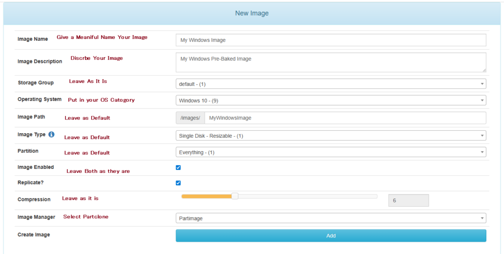 On your FOG Server, go to Images on the top menu and then Create Image on the side menu. Fill in the form as shown and click Add.