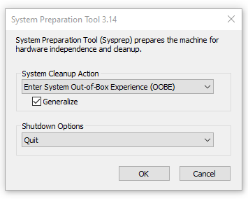 On the Sysprep Window,Β make sure Enter System Out Of Box Experience (OBBE) is selected and the Generalise box is ticked. In Shutdown Options, click Quit. Click OK.