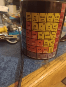 I grabbed this mug at the end of my shift. I payed a decent price for it, along with 2 bathroom mats. (Under a fiver) I love this mug, it has the Periodic Table of Text Messaging on it. This is a list of short codes used during texting. IE: WYL = Watch Your Language) It also has the codes for different similes. It is proper cool and I love it! πŸ™‚